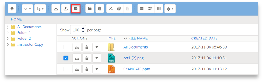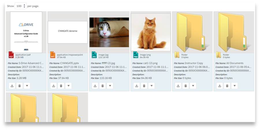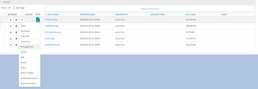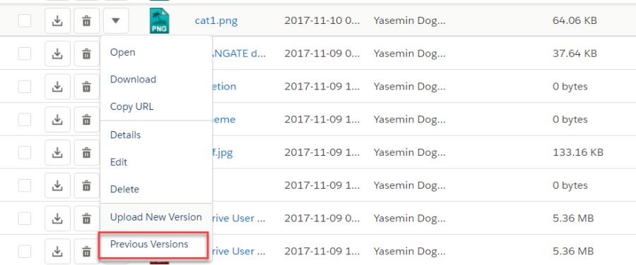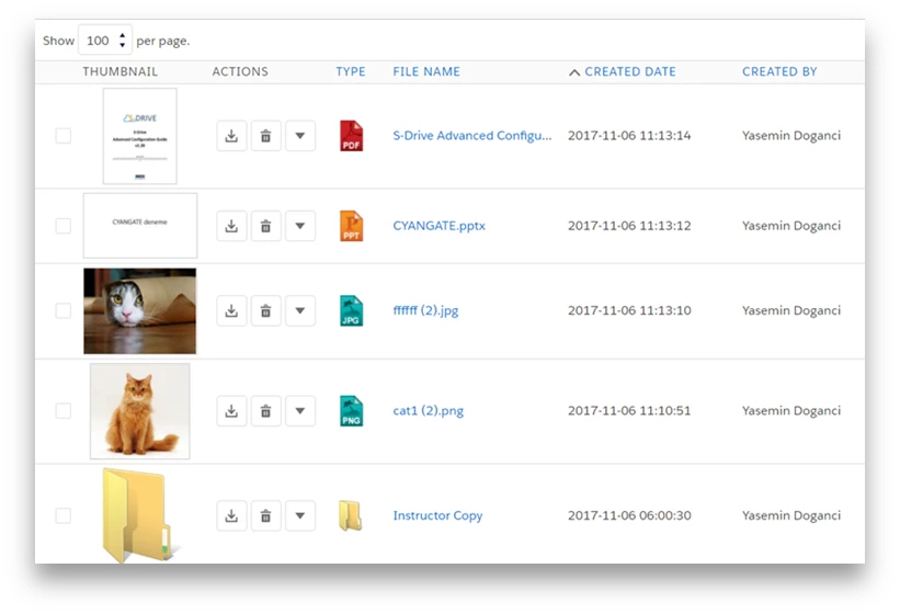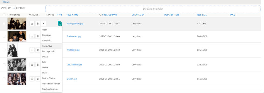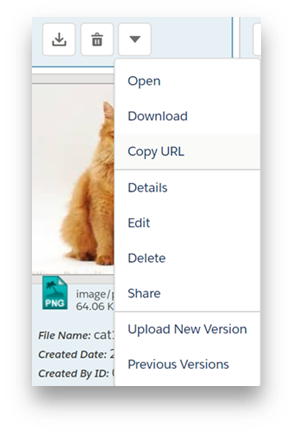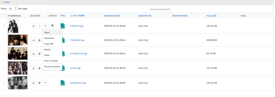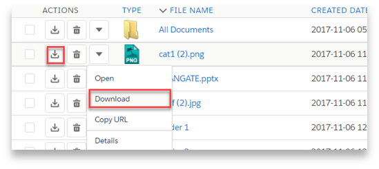 Back on the List View, the "Actions" column is used to display action buttons. The buttons shown here are based on configuration and profile permissions. There are two quick buttons for the most commonly used actions: Download & Delete. Clicking the down arrow button, shows a dropdown menu with more actions. Let's review the details about these item actions.