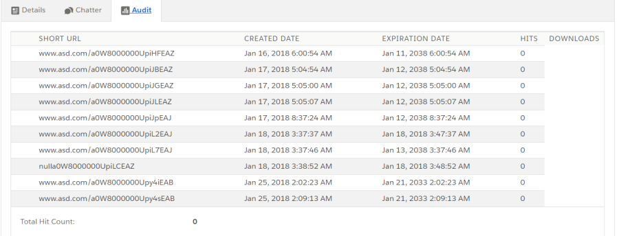 The Audit view consist of information about the URL of the file, the created and expiration date, and hit and download counts.