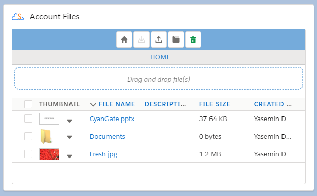 "Customizable Field Columns" are used to display customizable fields. Your Salesforce.com account's system administrator can change this customizable list using "S-Drive Configuration" page. If nothing is configured, you will see, "Created Date", "Created By", "Description" and "File Size" columns by default. You can sort files/folder ascending or descending by clicking the field header if sorting is allowed for that field type.