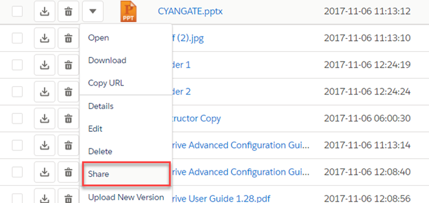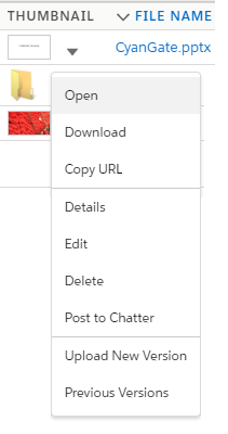 Post to Chatter: This option is displayed only for files. You can post your thoughts related to this file by clicking on this action menu item. See "Posting to Chatter" section for more information.