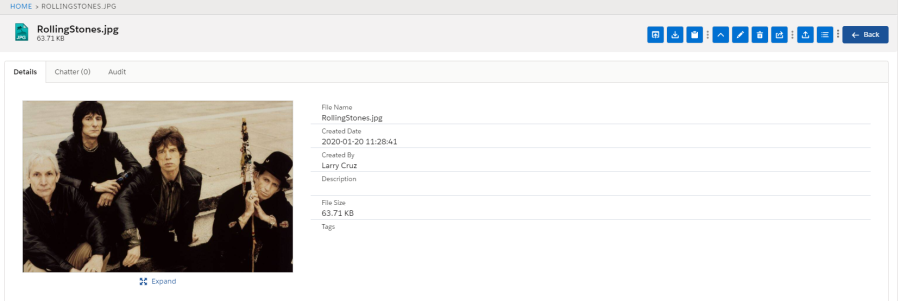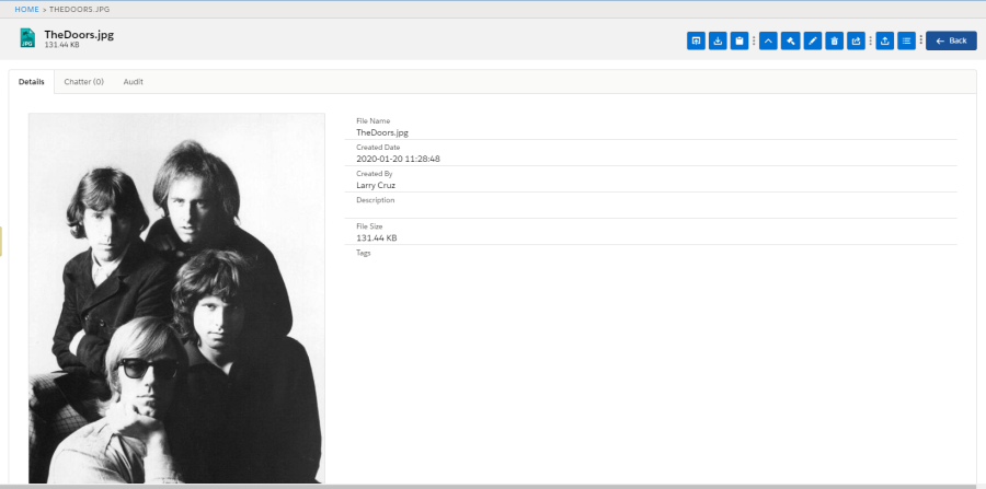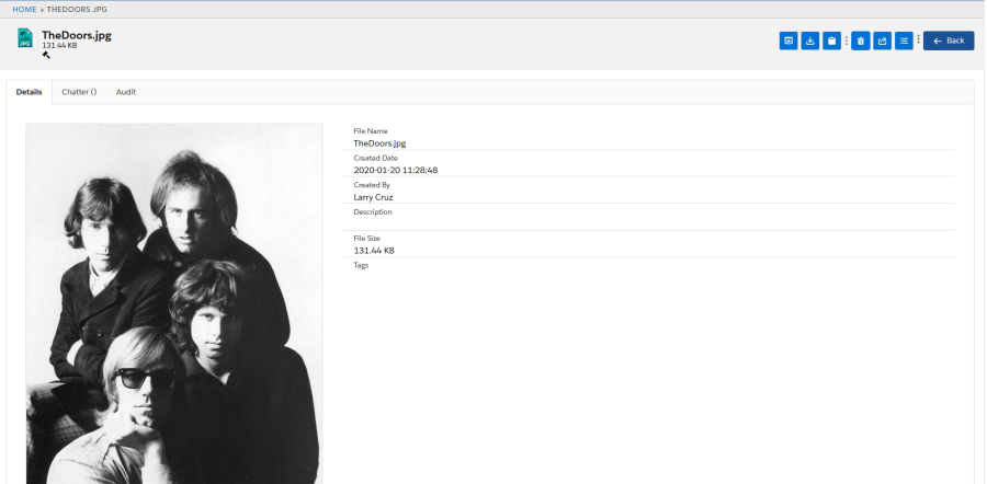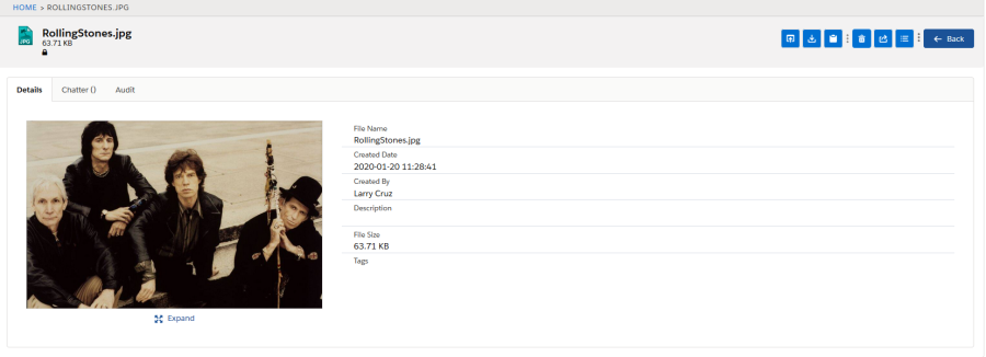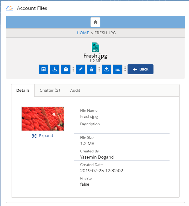 On the Detail page there are different tabs to navigate, to view different kinds of information about the file. These three tabs are "Detail", "Chatter" and "Audit".