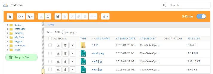 The regular S-Drive page will be opened, and on the right-hand side of the toolbar menu, under the search bar, you will see a toggle button called "myDrive". When you click on this button you will switch into a new page called "myDrive".