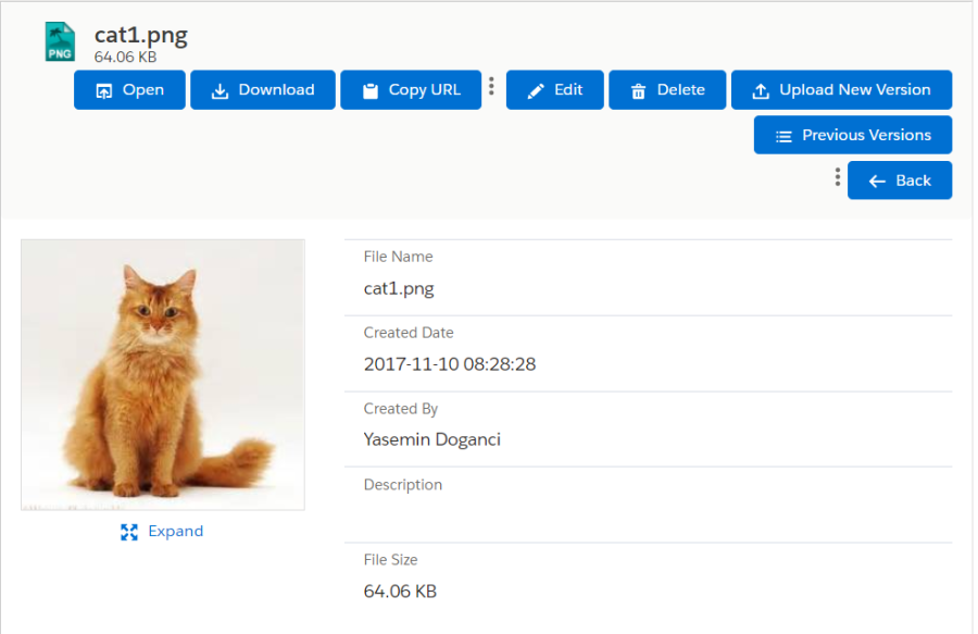 "Details" is used to open the details page of the selected custom object file or folder. In details page, it is possible to see the detailed information about that file or folder. Also, if the preview and thumbnails option is enabled, the thumbnail of a file can also be viewed from this page.