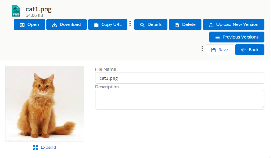 The Detail view consist of three main parts: Preview image of file if it exists, File properties & custom fields and Action buttons.