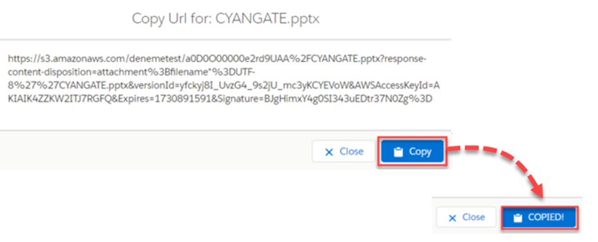 "Copy URL" is used to copy the URL of the selected custom object file. After clicking this link, a popup will appear along with the URL of the selected file (Figure 100). This item menu action is only for files and not available for folders.