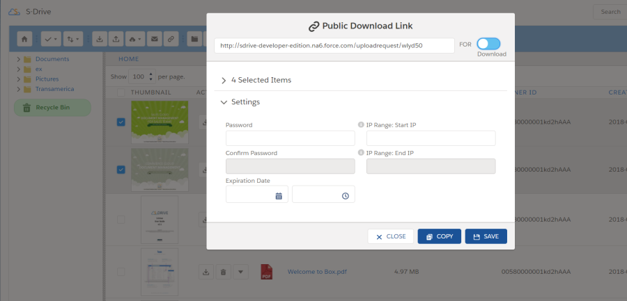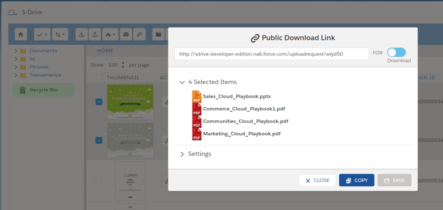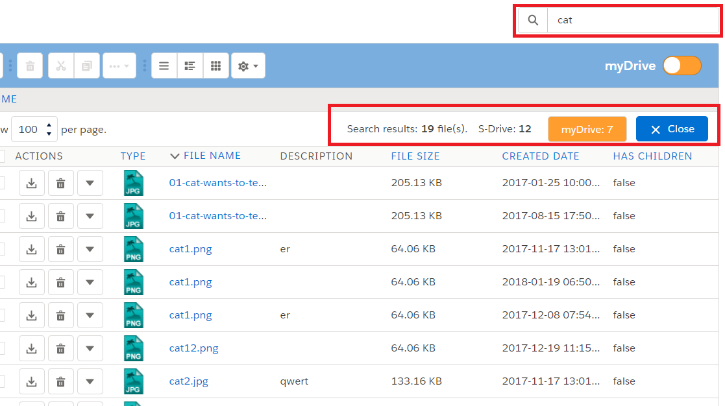 Note: If your admin changed the settings of 'MyS3Object' in Salesforce's Sharing Settings, your files and folders in myDrive might be visible to others. To make your myDrive private to you, contact your admin to change the sharing settings to "private".