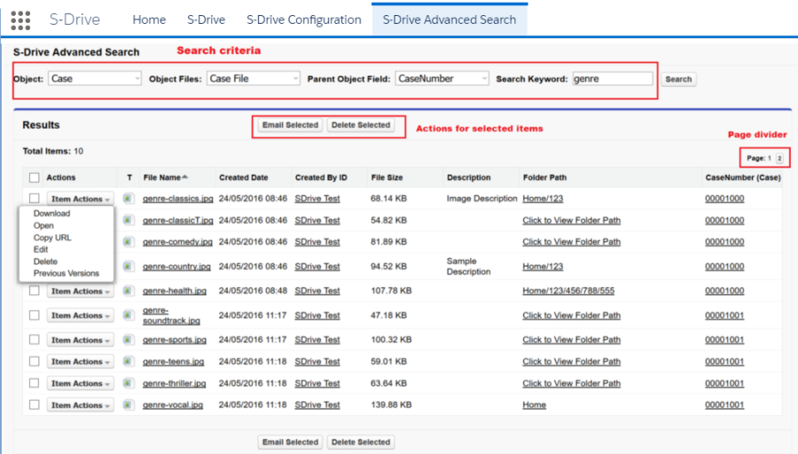 S-Drive Advanced Search helps to perform improved search functionality in object files. AdvancedSearchPage and AdvancedSearchComponent created for that. You can use AdvancedSearchComponent with your own VF pages. You can access to this feature using S-Drive Advanced Search tab.