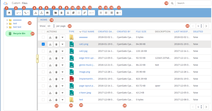 (12) Create Shortcut allows you to create a shortcut of a file on another record. This allows you to see a file in more than one place.(13) Custom Actions button is used to perform custom actions. See "Custom Actions" section in "S-Drive Admin Guide" for more information.