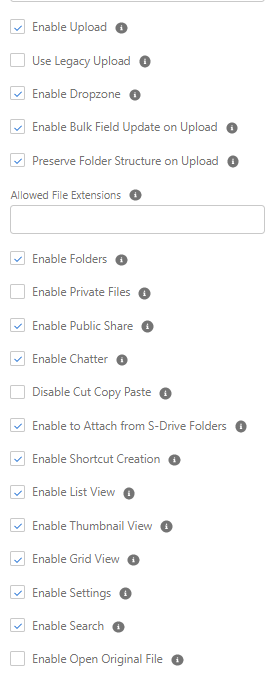 Enable private files This option is used for enabling public/private file access to the S-Drive attachments and commonly used to limit the customer portal users' access to individual files. The ability for users to configure this is determined by the main configuration settings in S-Drive Configuration Tab. If the checkbox is checked, you will see the public/private flag. Set this attribute to true by checking the checkbox, if you want to enable private/public flag. Setting the private flag on a file hides the file from customer portal users. The default value for this checkbox is unchecked.