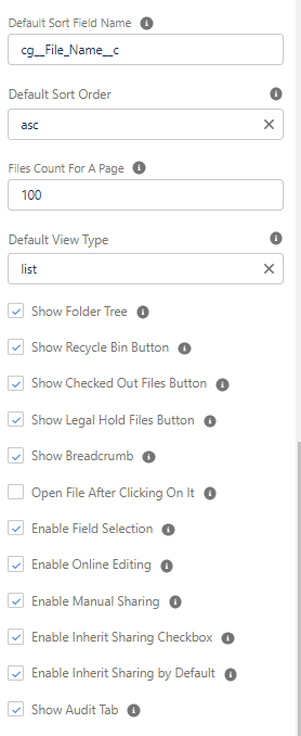 Enable Inherit Sharing by Default This option controls whether the Inherit Sharing checkbox is checked or unchecked by default. If you hide the Inherit Sharing checkbox, you still need to use this setting to determine whether Inherit Sharing is true or false when subfolders are created and files are uploaded.