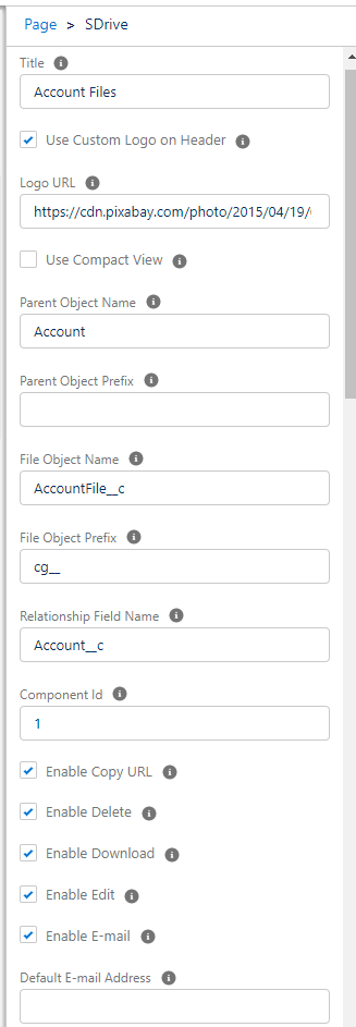 Edit the required fields correctly to configure the S-Drive component for Account Files (or Contacts, Cases, Opportunities, Leads) You can also change the settings for a selection of checkboxes , which are explained below in the Component Attributes section.