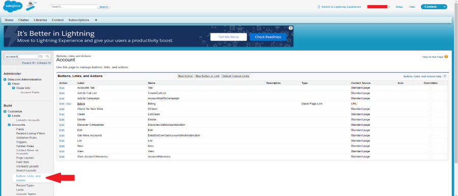 In Salesforce Classic view, click Setup button on right top and go to Build-> Customize-->Accounts (or Cases or Contacts or Opportunities or Leads the label of the object that you want to enable S-Drive Attachments for) -> Buttons, Links, and Actions.