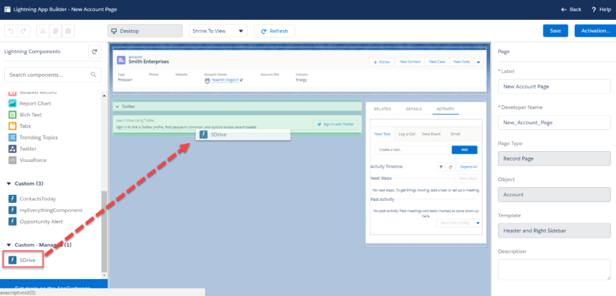 After clicking on "Save" button, you need to activate the page in order to use the S-Drive component. You can click on "Activation" and choose "Assign as Org Default" or "Assign as App Default" from the pop-up screen, in order to view the S-Drive component. Now, you should see "Account Files" page block at the end of the account object record page.