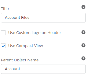 In a configuration like the figure above for Account Files, the following fields will be shown in the component: File Name, Description, File Size and Created By ID.