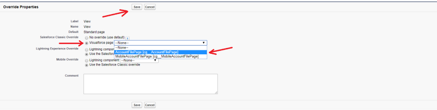 Select Visualforce Page for Override With section and pick related Visualforce page (AccountFilePage for Accounts, CaseFilePage for Cases, ContactFilePage for Contacts, OpportunityFilePage for Opportunities, LeadFilePage for Leads) from the drop-down box. Click Save button to complete the override.