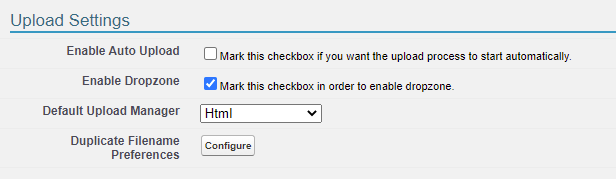 Enable Dropzone This setting enables the drag and drop feature for uploading files