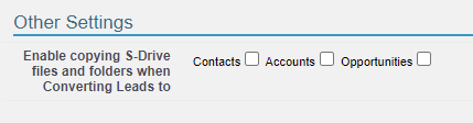 Enable Copying S-Drive Files and Folders When Converting Leads To This configuration is used to enable users to choose where to copy S-Drive files in Leads when a lead is converted. Available options are Accounts, Contacts and Opportunities. See Lead Conversion with S-Drive Files for details.