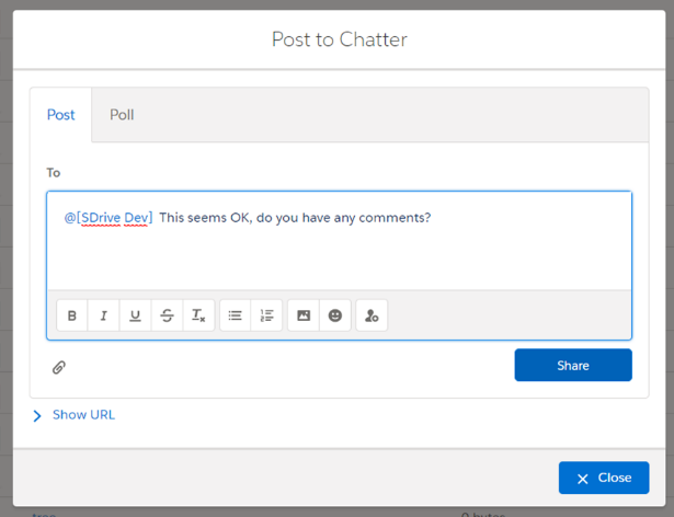 g. "Post to Chatter" is used to post comments/thoughts about a file to Salesforce Chatter. After clicking, a pop-up screen will appear, and you will be able to create a post or a poll, mention users, and share your thoughts about a file.