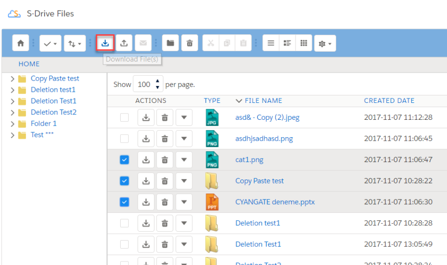 "Download File(s)" button is used to download selected file(s). If just one file selected it directly download file. If more than one file or folder are selected, it creates a zip file and download it.