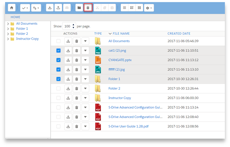 The Recycle Button takes you to the S-Drive Recycle bin, where you can either restore deleted files or hard delete them. The Recycle Bin does not automatically empty.
