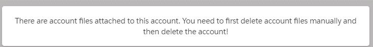 You cannot delete an account which has account files attached. You'll get an error message if you try to delete this kind of account. You need to delete account files first, and then you can delete the account.