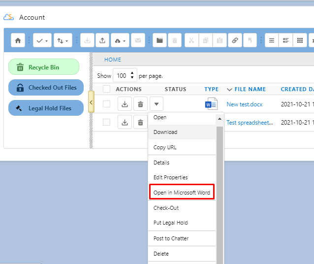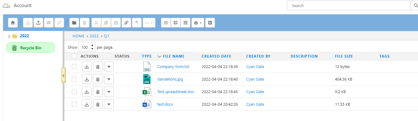 "Content Type Column" displays a type icon based on the content type of the account file/folder.