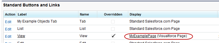 Go to Setup > App Setup -> Create> Object and click the label of your custom object. You'll see "Object Definition Detail" screen. Scroll down and find "Standard Buttons and Links" page block and click Edit action next to the View label (Figure 714-a). Then select Visualforce Page for Override With section and pick MyExampleFilePage (the custom page you created previously for this object) from the drop-down box. Click Save button to complete the override (Figure 7 14-b).