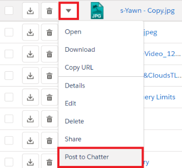 Post to Chatter: This option is displayed only for files. You can post your thoughts related to this file by clicking on this action menu item. See "Posting to Chatter" section for more information.