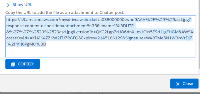 c. Copy URL" is used to copy the URL of the selected account file. After clicking this link, a popup will appear along with the URL of the selected file. This item menu action is only for files and not available for folders.