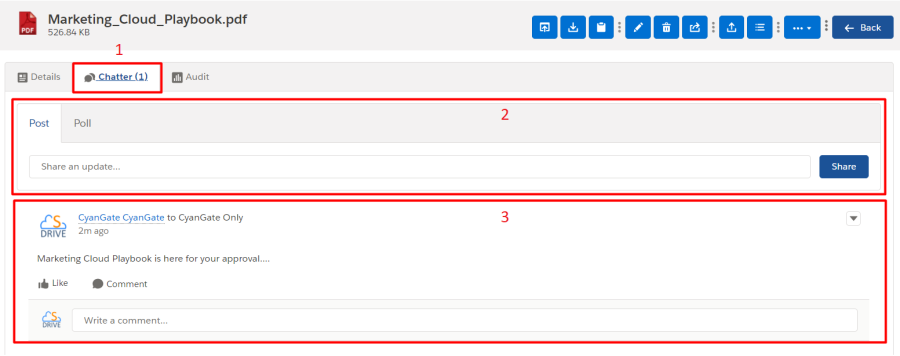 g. "Post to Chatter" is used to post comments/thoughts about a file to Salesforce Chatter. After clicking, a pop-up screen will appear, and you will be able to create a post or a poll, mention users, and share your thoughts about a file.