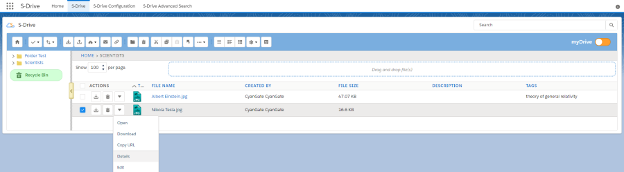 Details: For a file or folder when you click Details action, a modal window opens with file thumbnail and all information about file or folder. For more information, see Details Window.