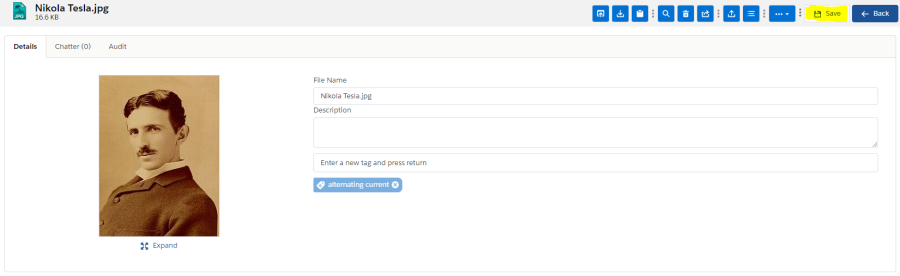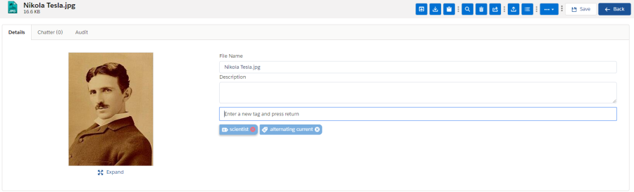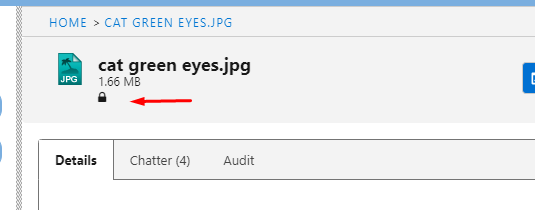 On the Detail page there are different tabs to navigate, to view different kinds of information about the file. These three tabs are "Detail", "Chatter" and "Audit".