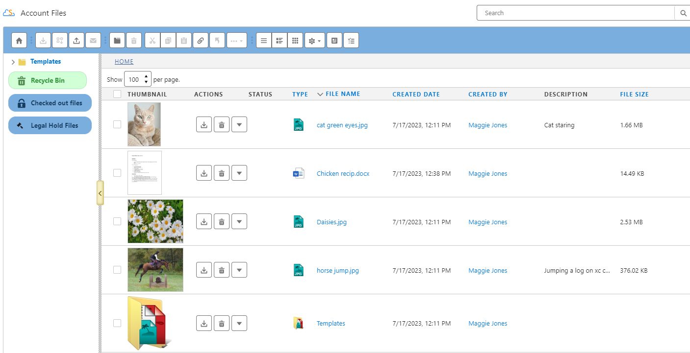 The main panel shows the list of files, the action menu, file type, and columns of information as set by the System Admin. This list can be shown in List View (seen here), Thumbnail View, or Grid View. See View Types for more information. From here, you can choose files and folders and perform actions on them (download, open, edit, etc.)