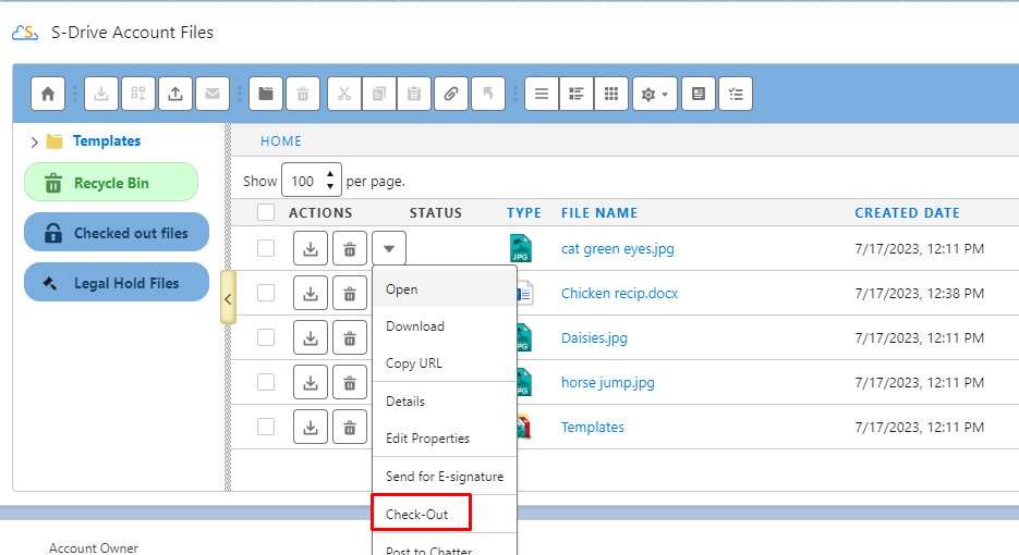 Legal Hold lets you lock files, preventing others from modifying or deleting the file. It is similar to Check-In & Check-Out but with some minor differences. File objects that can be put under legal hold should be explicitly selected from the S-Drive configuration page, and only certain users, i.e., System Administrators and holders of RemoveLockPermission, can put files under legal hold and remove files from legal hold. If the feature is enabled from the configuration page and the file object (e.g. cg_S3Object_c) is selected, a file that isn't under legal hold would have a button called "Put Legal Hold" under its action menu and its details page shows a gavel icon, which again lets users put the file under legal hold.