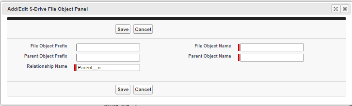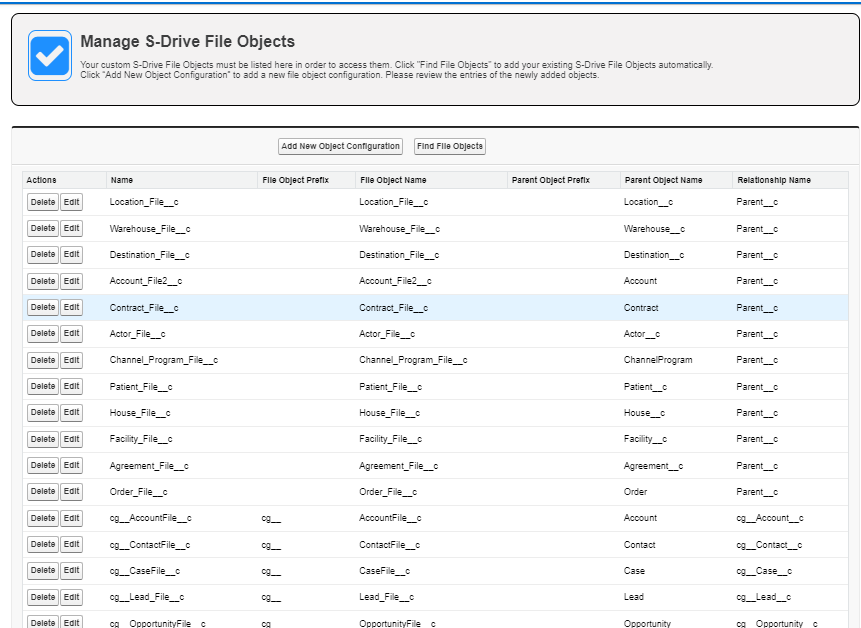 S-Drive needs to know which custom objects in your org are S-Drive file objects. The out-of-the-box S-Drive file objects (Account File, Contact File, Case File, Opportunity File and Lead File) are automatically on the list. New custom file objects must be added.