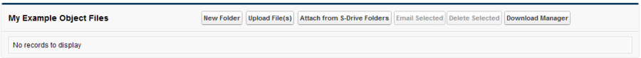 After creating a test object, you should see "My Example Object Files" page block at the end of the object detail page (Figure 716). See "User Guide" for more information on how to use the buttons and functions in this page block.