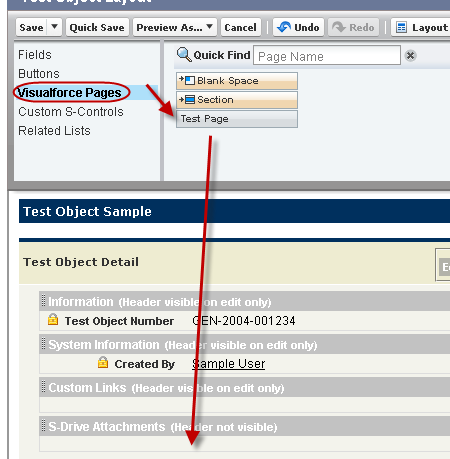 Now, go to Visualforce Pages from the top. Select the "custom page name" you created (e.g. TestPage) and drag it into the section that you created previously