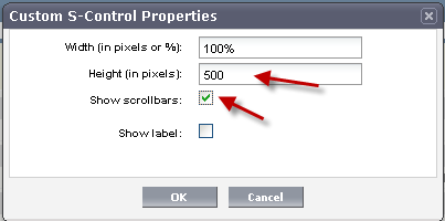 Keep "Width (in pixels or %)" as "100%", set "Height (in pixels)" to "500". And check "Show scrollbars" option. You can optionally check "Show label". Click OK button
