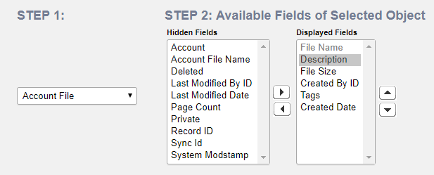 In a configuration like the figure above for Account Files, the following fields will be shown in the component: File Name, Description, File Size and Created By ID.