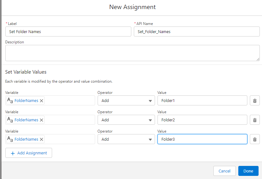 2. Use an Assignment element to list the names of your folders. Even if you only have one folder, you must put it in an Assignment element using a collection variable.