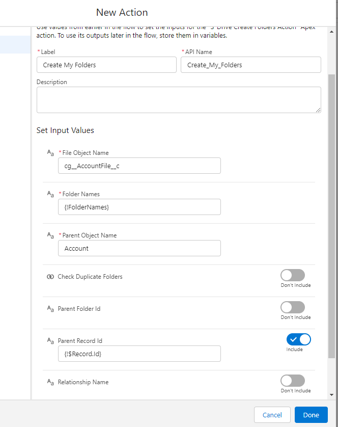 Parent Record Id: Id of the record the folders are being created on, such as the Account record id. This is not needed for S-Drive Tab (S3Object)