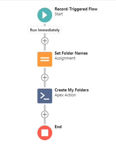 Here are the steps for a sample flow to create 3 folders when an Account is created. Some knowledge of Flows is assumed. Refer to Salesforce documentation if you need help with Flows.