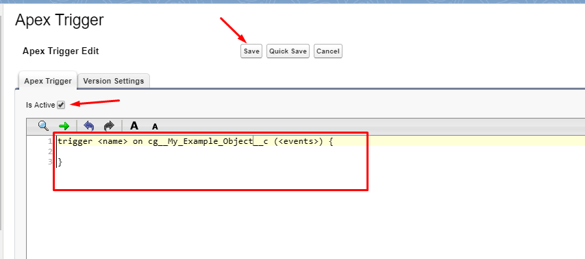 In this step we'll create a before delete trigger for our custom object. This trigger is used to prevent deletion of the object if it has custom object files in it. This step is an optional step, but we strongly recommend creating this trigger. The following steps will explain the creation of the trigger: