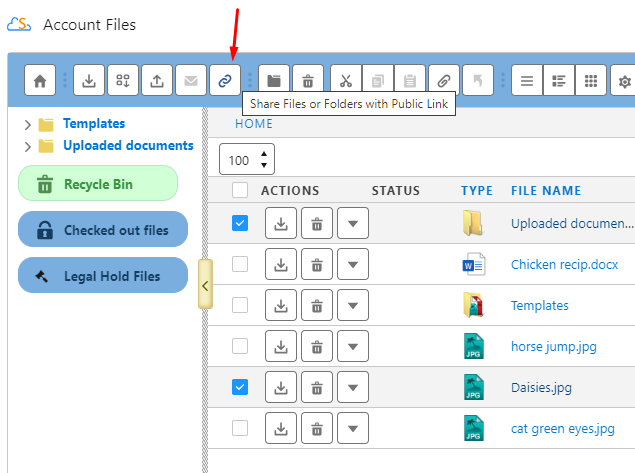 A popup will open where you can choose to create a link that will download files immediately (download link) or show the files in an S-Drive component (access link), where the recipient can open or download the file, and depending on configuration, can upload a new file.
