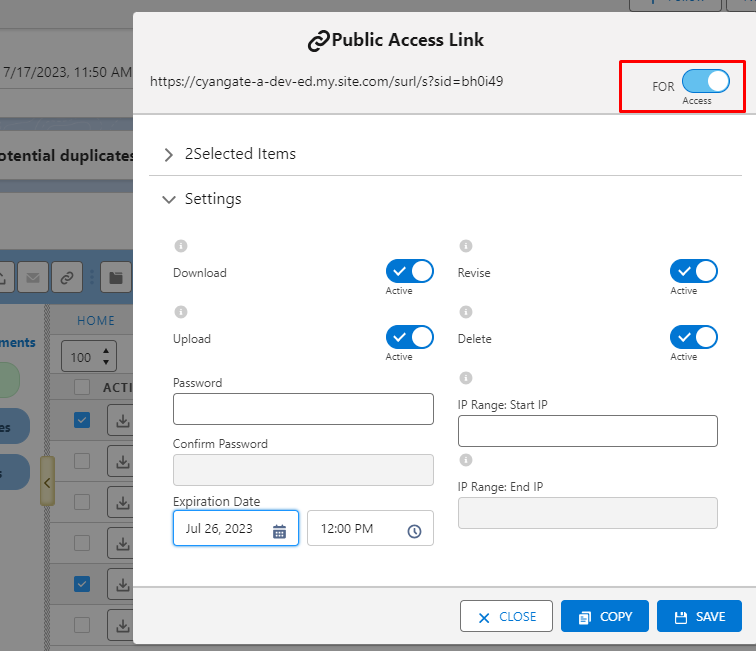 In S-Drive Configuration Micro Services tab, you may choose to require a password and/or an expiration date on all public share links. If checked, users will see those fields as required when creating a public share link and will not be able to copy the link until those fields are filled in and saved.