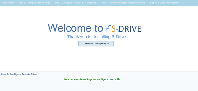 This step is required to connect your Amazon S3 account with S-Drive. You need to enter a valid "Amazon Access Key" and "Secret Key". After providing keys, if you see "Amazon S3 Credentials are configured correctly," continue with the next step.