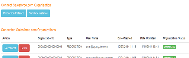 After entering login credentials, you’ll see your organization on the list of “Connected Salesforce.com Organizations.”