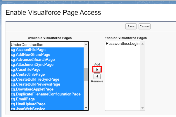Go to Visualforce Pages and add all pages that start with “cg.” Click Save.