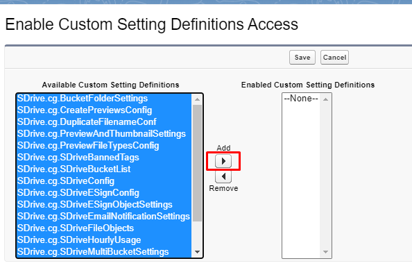 Go to Custom Setting Definitions and add all settings that start with “SDrive.cg.” Click Save.