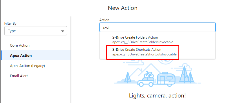 Type S-Drive in the search box and choose S-Drive Create Shortcuts Action